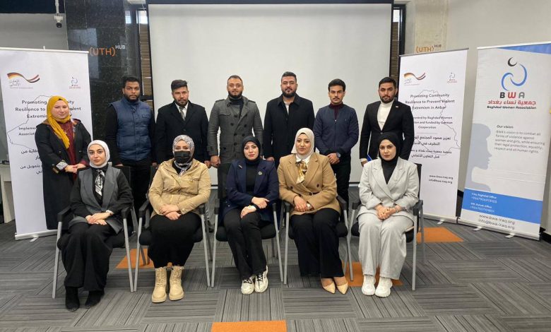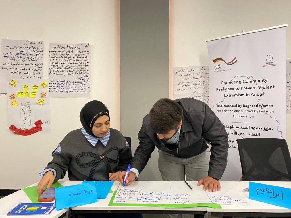 As part of the project “Promoting Community Resilience to Prevent Violent in Anbar,” funded by German Cooperation, Baghdad Women Association implemented the activity “Resilience Leaders Capacity-Building Training” during the period from 9 to 16 December 2025, in Anbar Governorate – Ramadi City, over the course of six days. The training targeted 10 young women and men from active community members, who were selected in coordination with the Violent Extremism Committee in Anbar and a number of local activists. The training aimed to empower participants to play an effective role in strengthening social cohesion and preventing violent extremism. The training was characterized by a high level of interaction and participation, as trainees shared real-life examples from their communities, carried out practical applications and realistic role-playing exercises, and concluded the program by presenting feasible community initiatives aimed at reducing manifestations of extremism and strengthening the resilience of the local community.